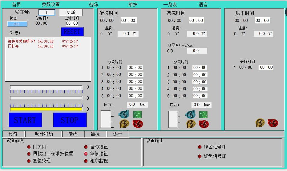 采用稳定可靠的进口品牌彩色触摸屏,针对:溶剂温度、清洗时间、漂洗次数/时间、 漂洗温度、烘干时间、烘干温度、电导率监控参数等等设定;